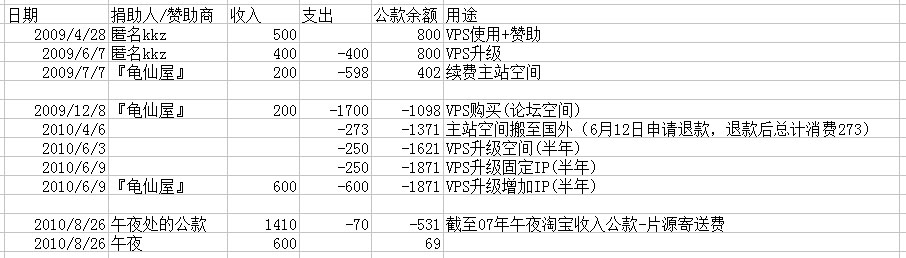 淘宝、漫展的另算;捐助的只用作空间费用;域名的几十元由几个管理员各自承担;测试的3个月一半算自己的,一半算公费;